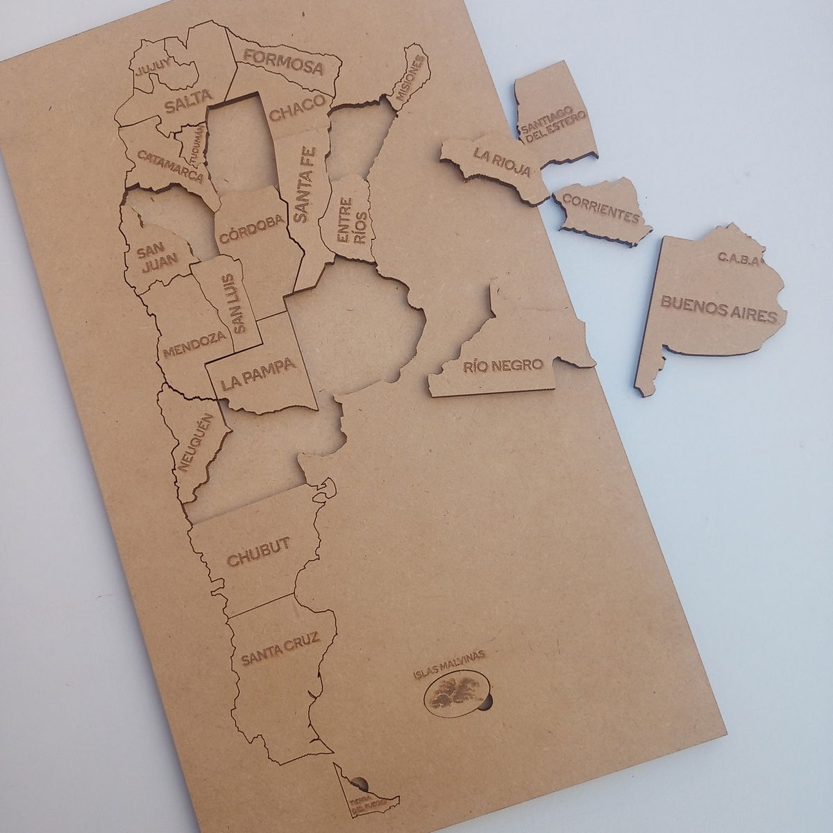 Realizado en MDF de 3 mm, este juego estimula la motricidad fina, la coordinación mano-ojo, la orientación espacial y despierta la curiosidad por aprender sobre las provincias y el territorio argentino.