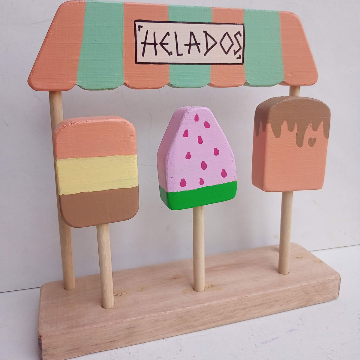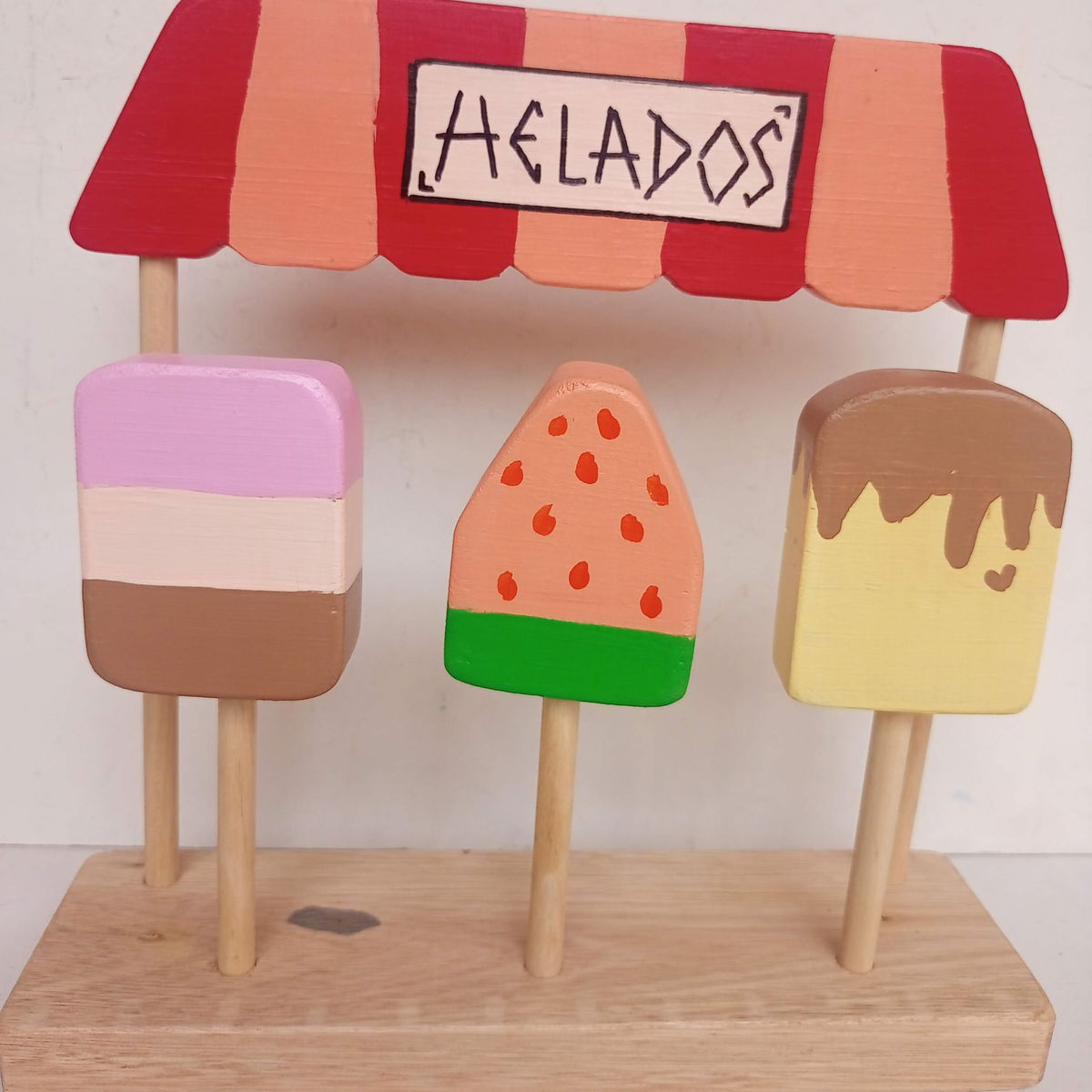 Este adorable set de heladería de madera incluye una base con toldo y tres helados.